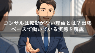 コンサルの実態 コンサルは転勤がない理由とは?出張ベースで働いている実態を解説 「コンサルに転職したいけど、転勤があるのだろうか」「コンサルって全国の企業が顧客のイメージがあるけどどうやって働いているんだろう」特に家を買ったばかりであったり、子どもが大きくなってきて今の場所から引っ越しできない人は転職先の転勤の有無が気... 2025.10.08 コンサルの実態