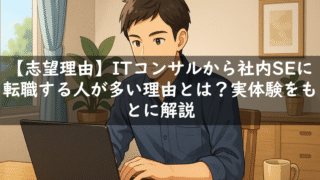 転職関連 【志望理由】ITコンサルから社内SEに転職する人が多い理由とは?実体験をもとに解説 「ITコンサルの次の転職先はどうしようかな」「そろそろホワイトに働きたい」「また事業会社で働きたい」私はITコンサルとして働いてきて、将来のキャリアパスを考える機会が増えてきました。転職活動を実際に実施しており、転職エージェントと会話する中... 2025.06.19 転職関連
